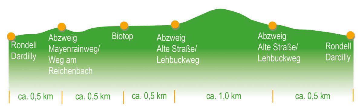 Beginnt man den Lehrpfad in der Dorfmitte/Rondell Dardilly an der Schautafel, führt er durch bebautes Gebiet in die Weberstraße. Unmittelbar nach der Post biegt er links ab in den Mayenrainweg hinauf in Richtung Wittnau. Nach den letzten Häusern geht es auf einem steilen, schmalen Waldweg nach Au hinunter. Am Fuß der Böschung entlang erreicht er den Bauhof/das Feuerwehrhaus, hinter dem ein Biotop samt Informationstafel angelegt ist. Von dort aus geht er durch das kleine Gewerbegebiet Richtung Merzhausen zurück und überquert bei der Fußgängerinsel die Landstraße L 122. An der Haltestelle „Schloßberg“ vorbei weist unmittelbar nach der Schloßbergbrücke eine Orientierungstafel den weiteren Weg. Am Brunnen vorbei führt die Alte Straße in Richtung in Richtung Merzhausen. Vor den Tennisplätzen biegt der Lehrpfad rechts ab auf den unbefestigten Waldweg "Lehbuckweg" Richtung Mühlebuck hinauf. Er hält sich beim ersten abzweigenden Waldpfad links und gelangt nach einigen hundert Metern oberhalb des Lehhaldenhofes an eine größere Abzweigung mit Sitzbank. Dort biegt der Lehrpfad auf die geteerte Straße hinunter zur Alten Straße ab, die nach rechts Richtung Merzhausen führt. Über den links abgehenden Mühleweg hinunter gelangt zur Ortsmitte zurück.
